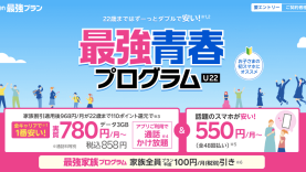 楽天モバイル 楽天モバイル、既存ユーザーも含めた22歳以下ユーザーを対象に毎月110ポイント還元する「最強青春プログラム」を3月12日より提供開始。「最強家族プログラム」との併用で月額858円/3GBに