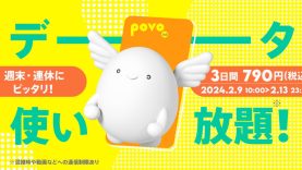 au/UQ/povo povo2.0、3連休向けに期間限定トッピング「データ使い放題(3日間)」の提供とデータ追加1GB(7日間)半額セールを開催(2/13まで)