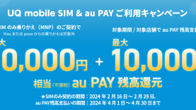au/UQ/povo UQ mobile、SIMカード契約とau PAY残高支払いの利用で最大10,000円相当を還元するキャンペーンを開催(2/29まで)