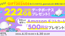au/UQ/povo povo2.0、新規加入でデータボーナス222GB(3日間)& 抽選でAmazonギフトカード 500円分をプレゼントするキャンペーンを開催(6/30まで)